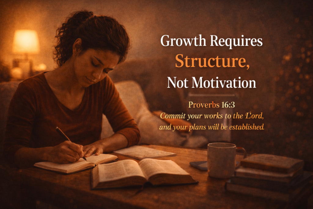 Many women are waiting to feel motivated before they act. They tell themselves they will start when they feel inspired, confident, or emotionally ready. But motivation is unreliable. It rises and falls with emotions and circumstances. Growth, however, does not respond to motivation; growth responds to structure. Proverbs 16:3 reminds us, “Commit your works to the Lord, and your plans will be established.” Growth begins with commitment, not feelings.Motivation is emotional, but structure is intentional. Motivation depends on how you feel, while structure depends on what you have decided. Women who grow consistently are not always motivated; they are structured. They have rhythms, boundaries, and routines that support their growth even on days when they feel tired, confused, or discouraged. Discipline anchored in structure keeps growth moving forward.Many women stop progressing because their lives lack structure. Their days are reactive instead of intentional. Prayer happens when there is time, rest happens only after exhaustion, learning happens randomly, and personal growth is treated as optional. Yet 1 Corinthians 14:40 says, “Let all things be done decently and in order.” Where order is missing, progress becomes difficult.God is a God of order, not confusion. Throughout Scripture, growth followed structure. God gave Noah clear instructions before deliverance came. Jesus lived a life of routine prayer and withdrawal, even while carrying great responsibility. Luke 5:16 says, “So He Himself often withdrew into the wilderness and prayed.” Even spiritual strength was sustained through structured habits.Structure does not mean rigidity; it means alignment. It means deciding when you pray, how you grow, what you protect, and what you refuse to compromise. Structure creates space for consistency, healing, rest, and obedience to function together. Proverbs 4:26 instructs us to “ponder the path of your feet, and let all your ways be established.” Establishment follows intentional planning.Many women say they are stuck, but in reality, they are unstructured. They want clarity without order, progress without discipline, and growth without boundaries. But clarity often comes after structure is established. Habakkuk 2:2 says, “Write the vision and make it plain.” When life is organized around what matters, direction becomes clearer.If you desire growth, start small and structured. Choose simple routines you can sustain. Decide specific times for prayer, learning, rest, and reflection, and protect those times. Galatians 6:9 encourages us not to grow weary in doing good, because in due season we will reap if we do not give up. Structure helps you remain faithful until the harvest comes.You do not need to feel ready to grow. You need to be willing to structure your life around where God is leading you. Motivation may start you, but structure will keep you there. When structure is intentional, growth becomes inevitable.